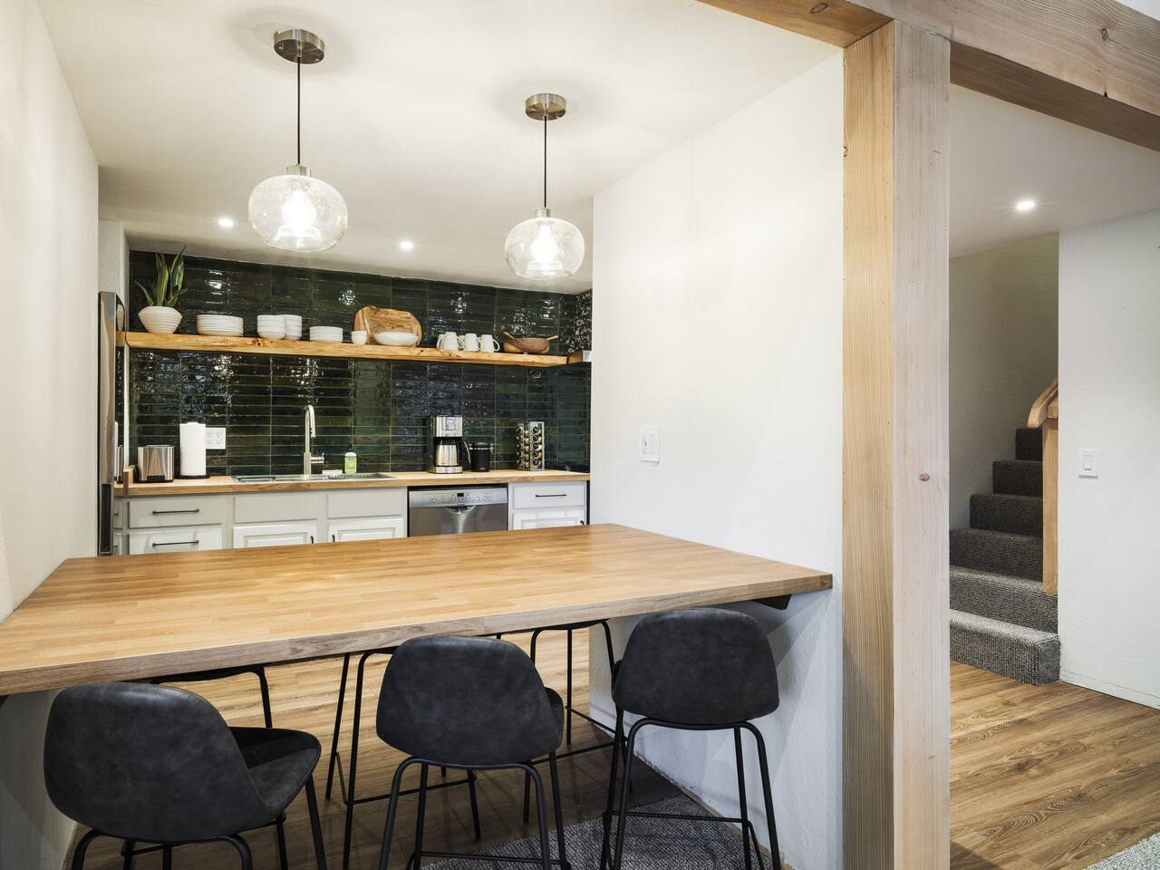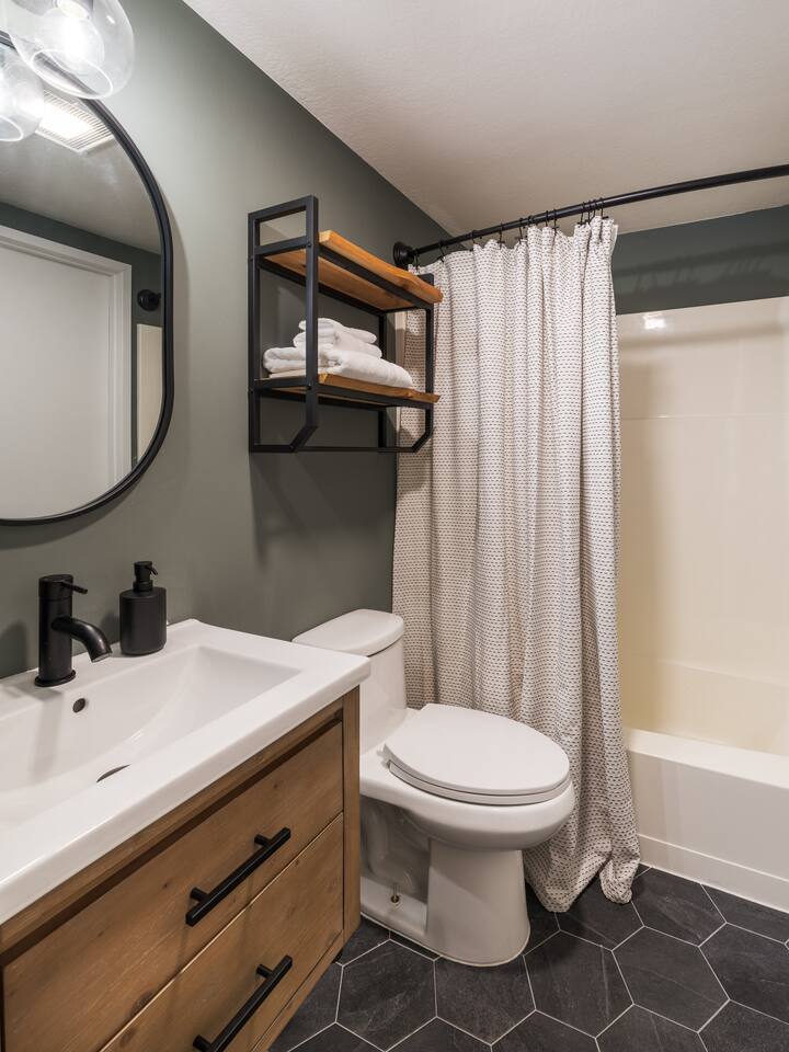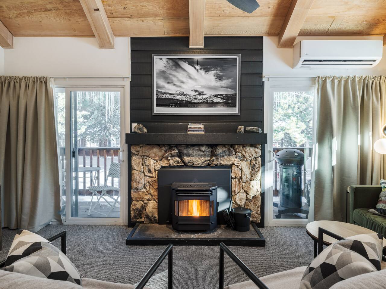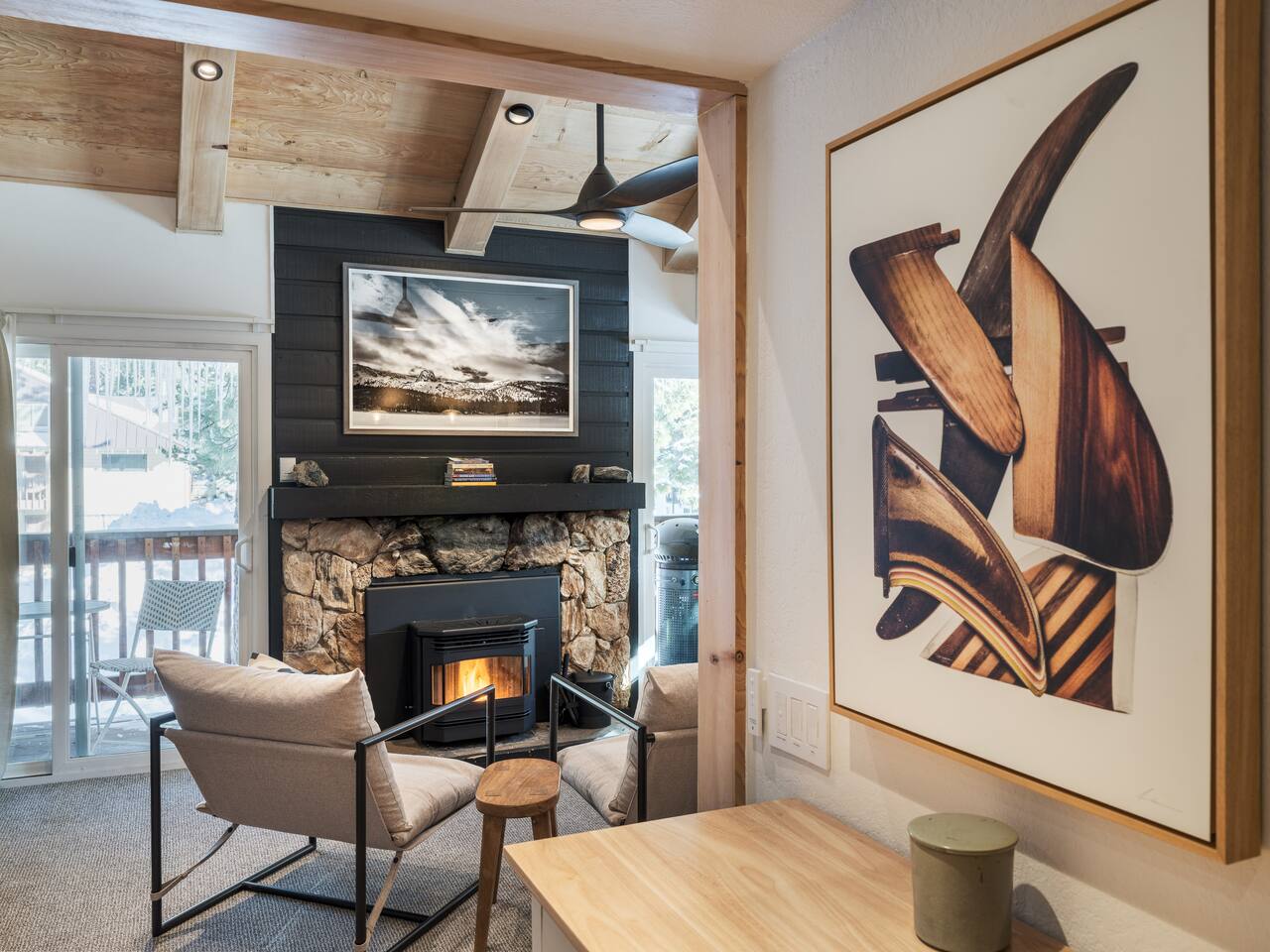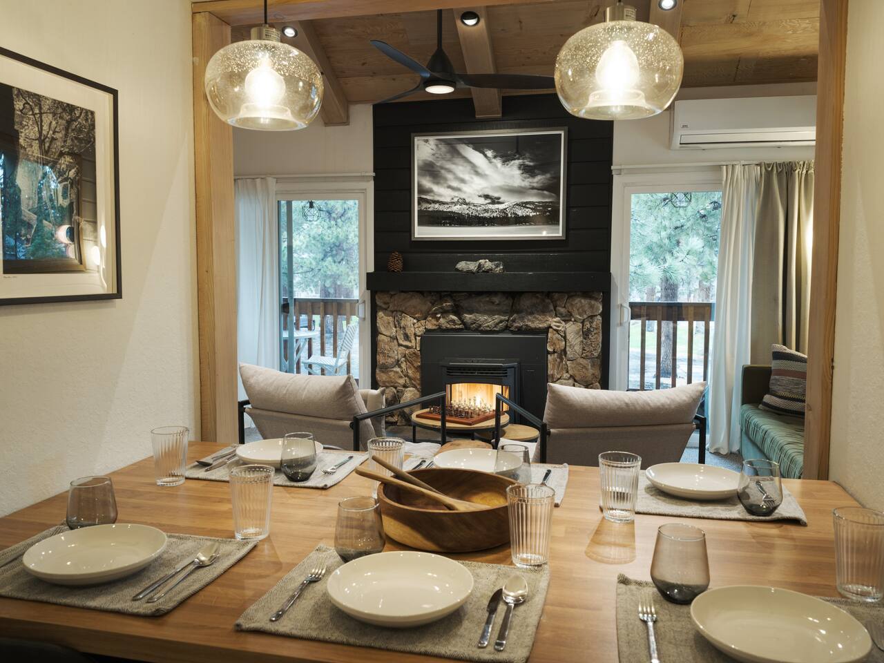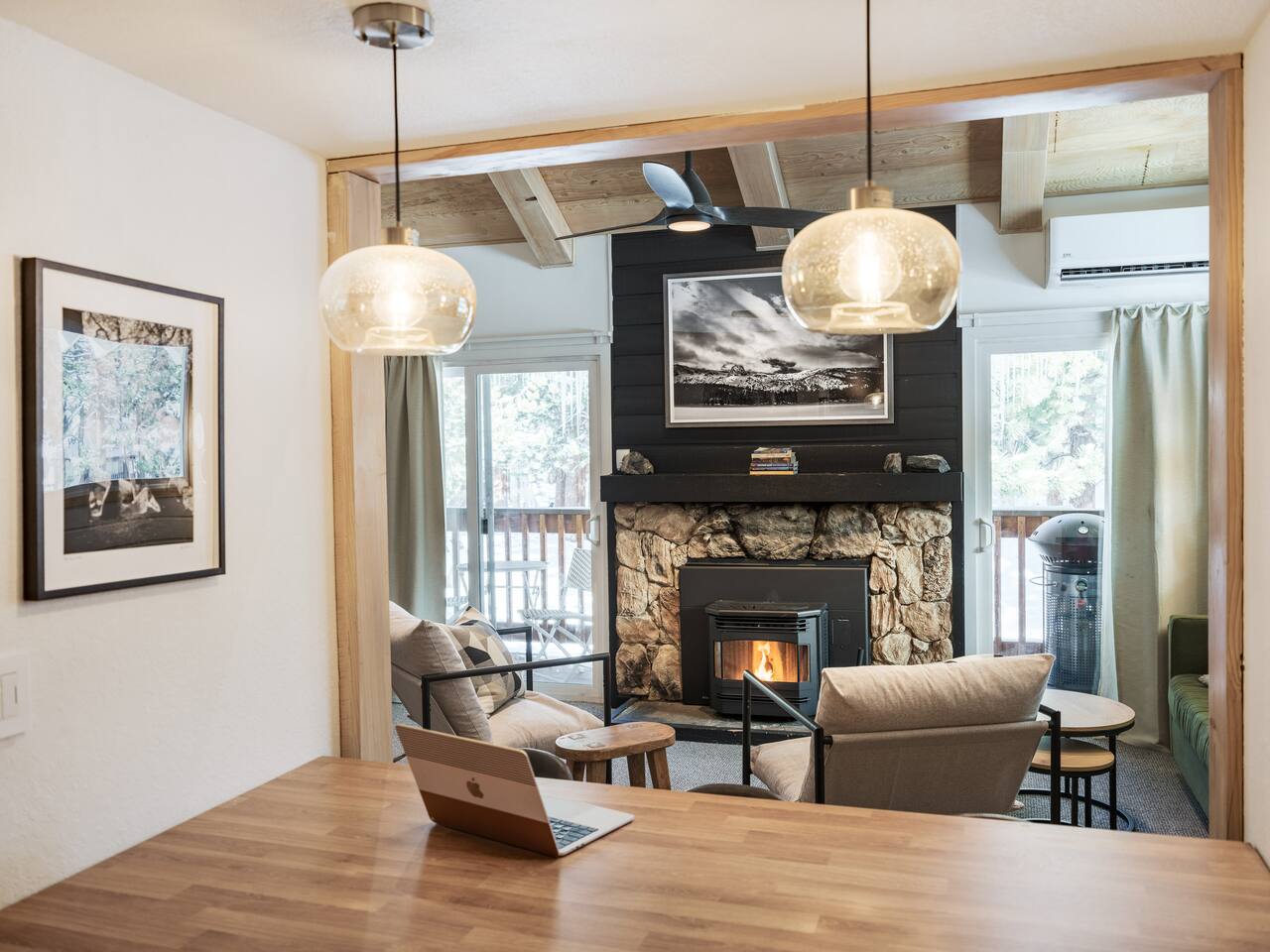 • ARTISAN DESIGN: Fall in love with the meticulous ceiling and wood details, handcrafted by a local artisan using sustainably sourced Fir. • PLUSH SLUMBER: Retreat to the master bedroom, outfitted with a king-sized bed draped in linen sheets atop an ultra-comfortable (and brand new) mattress. The loft boasts two full beds, also with linen sheets, ensuring restful nights for everyone. There's also a sleep sofa in the living room with queen mattress. • CHEF's PARADISE: The completely renovated designer kitchen awaits your culinary adventures. It's armed with an induction range, coffee maker, microwave, and spices. From whipping up quick breakfasts to crafting gourmet dinners, you have all the utensils at your fingertips. • UPDATED BATHS: Both our master bath and the upstairs bath come equipped with tubs and showers, with the master bath featuring a dual vanity. • LOFT-LIKE FEEL: The open floor plan and vaulted ceiling create a spacious and light-filled loft-like feel. Kick back in the living area, where the pull-out sofa and comfy chairs sit beneath a lofted ceiling. For entertainment, a 65” 4K TV with Apple TV ensures movie nights are always an option. • WORK AND PLAY: For those who mix business with leisure, a dedicated work area is set up with a monitor and desk. And when it's time to relax, let the Sonos sound system set the mood.