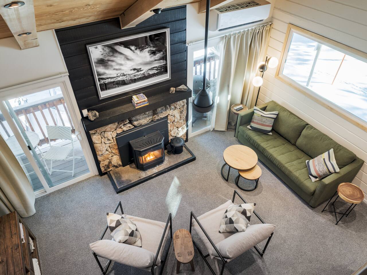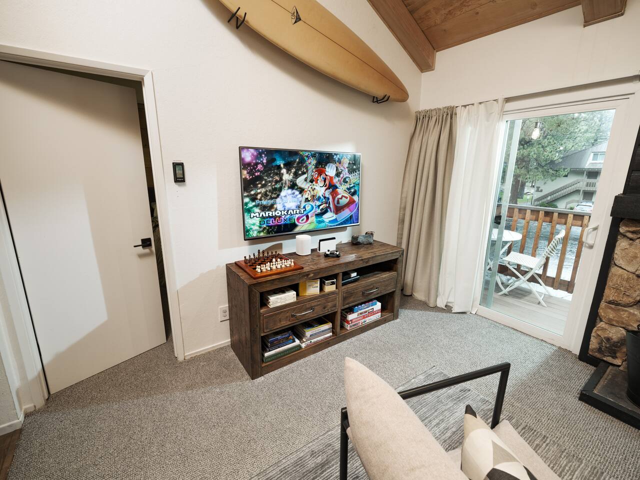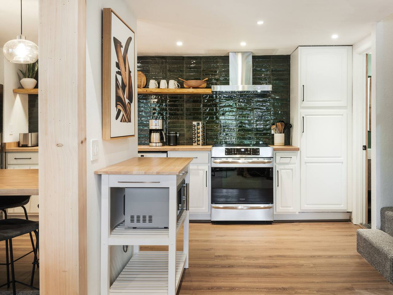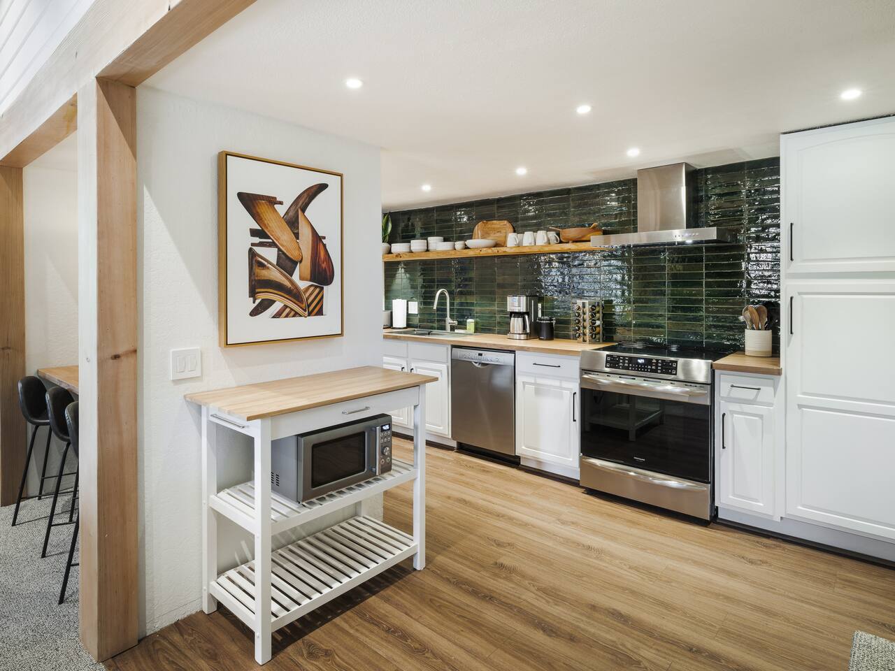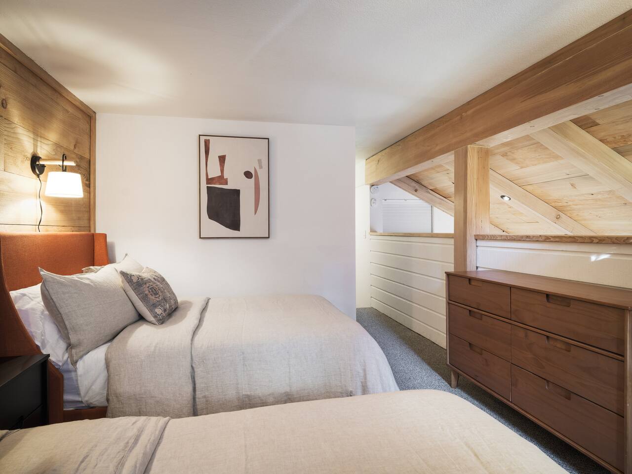 • ARTISAN DESIGN: Fall in love with the meticulous ceiling and wood details, handcrafted by a local artisan using sustainably sourced Fir. • PLUSH SLUMBER: Retreat to the master bedroom, outfitted with a king-sized bed draped in linen sheets atop an ultra-comfortable (and brand new) mattress. The loft boasts two full beds, also with linen sheets, ensuring restful nights for everyone. There's also a sleep sofa in the living room with queen mattress. • CHEF's PARADISE: The completely renovated designer kitchen awaits your culinary adventures. It's armed with an induction range, coffee maker, microwave, and spices. From whipping up quick breakfasts to crafting gourmet dinners, you have all the utensils at your fingertips. • UPDATED BATHS: Both our master bath and the upstairs bath come equipped with tubs and showers, with the master bath featuring a dual vanity. • LOFT-LIKE FEEL: The open floor plan and vaulted ceiling create a spacious and light-filled loft-like feel. Kick back in the living area, where the pull-out sofa and comfy chairs sit beneath a lofted ceiling. For entertainment, a 65” 4K TV with Apple TV ensures movie nights are always an option. • WORK AND PLAY: For those who mix business with leisure, a dedicated work area is set up with a monitor and desk. And when it's time to relax, let the Sonos sound system set the mood.