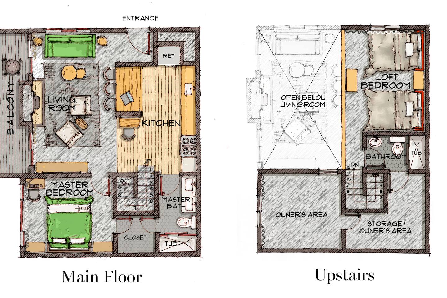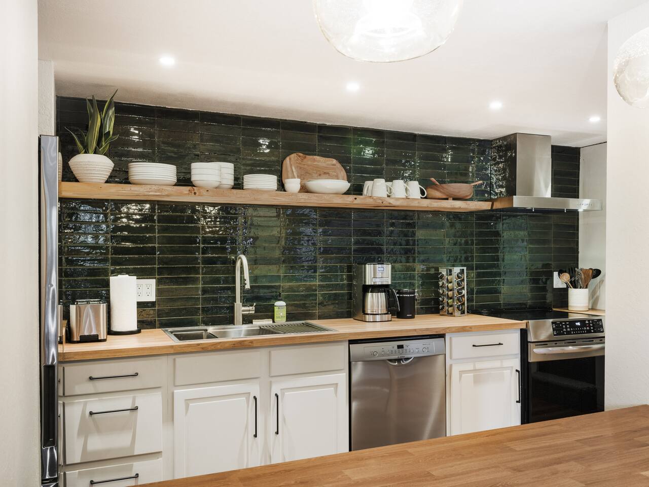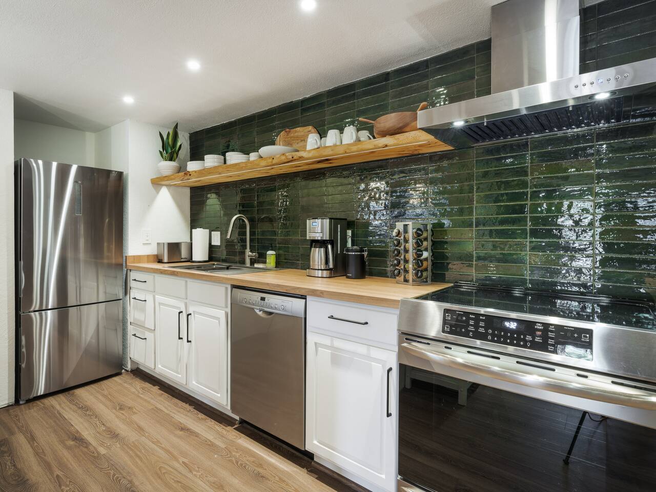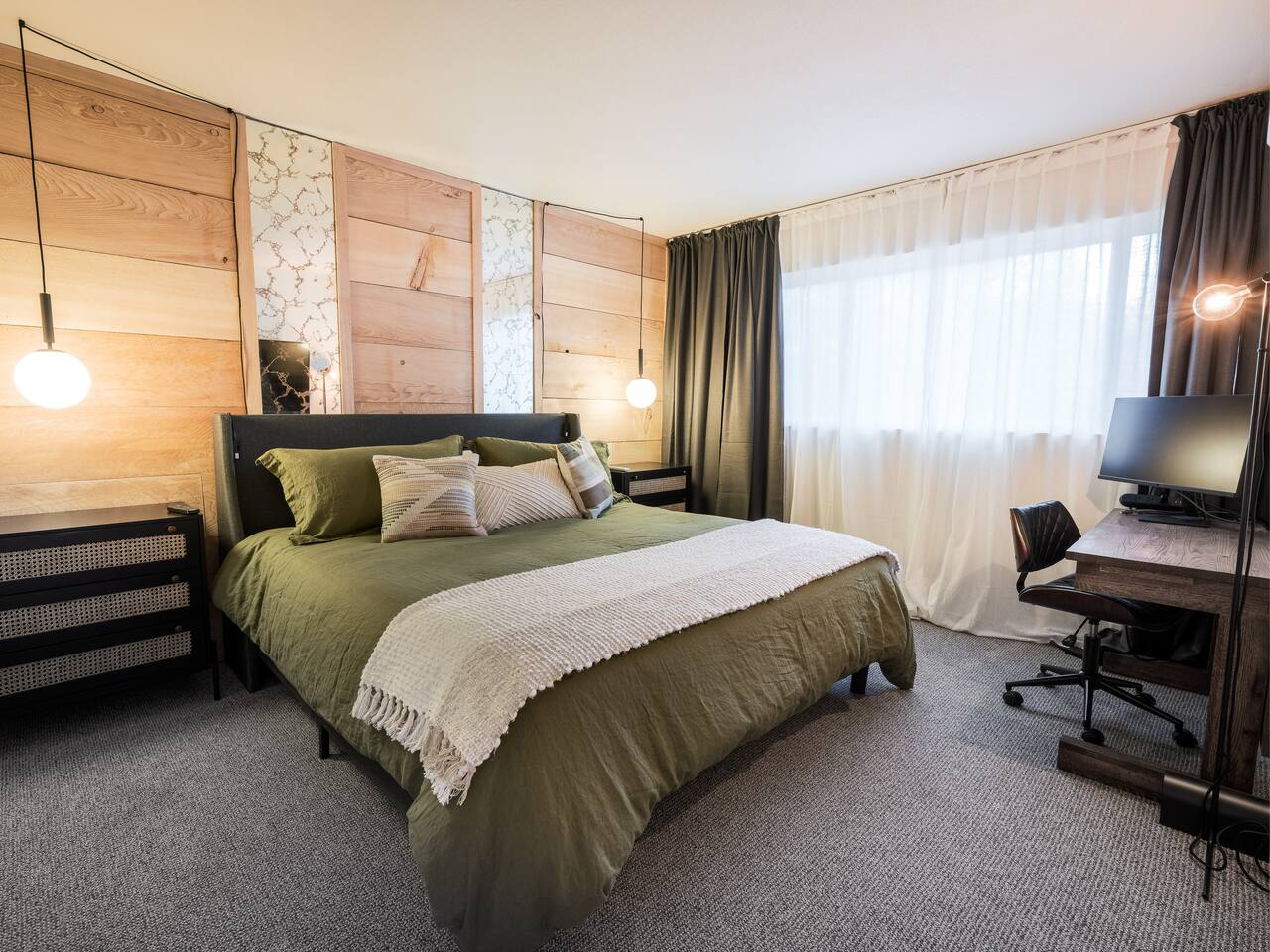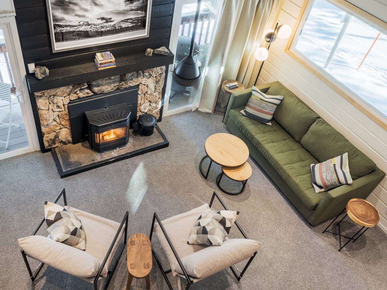 • ARTISAN DESIGN: Fall in love with the meticulous ceiling and wood details, handcrafted by a local artisan using sustainably sourced Fir. • PLUSH SLUMBER: Retreat to the master bedroom, outfitted with a king-sized bed draped in linen sheets atop an ultra-comfortable (and brand new) mattress. The loft boasts two full beds, also with linen sheets, ensuring restful nights for everyone. There's also a sleep sofa in the living room with queen mattress. • CHEF's PARADISE: The completely renovated designer kitchen awaits your culinary adventures. It's armed with an induction range, coffee maker, microwave, and spices. From whipping up quick breakfasts to crafting gourmet dinners, you have all the utensils at your fingertips. • UPDATED BATHS: Both our master bath and the upstairs bath come equipped with tubs and showers, with the master bath featuring a dual vanity. • LOFT-LIKE FEEL: The open floor plan and vaulted ceiling create a spacious and light-filled loft-like feel. Kick back in the living area, where the pull-out sofa and comfy chairs sit beneath a lofted ceiling. For entertainment, a 65” 4K TV with Apple TV ensures movie nights are always an option. • WORK AND PLAY: For those who mix business with leisure, a dedicated work area is set up with a monitor and desk. And when it's time to relax, let the Sonos sound system set the mood.