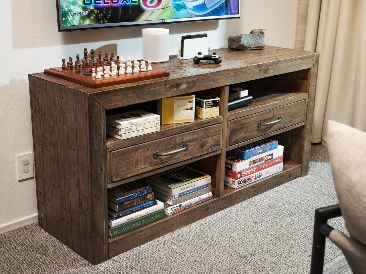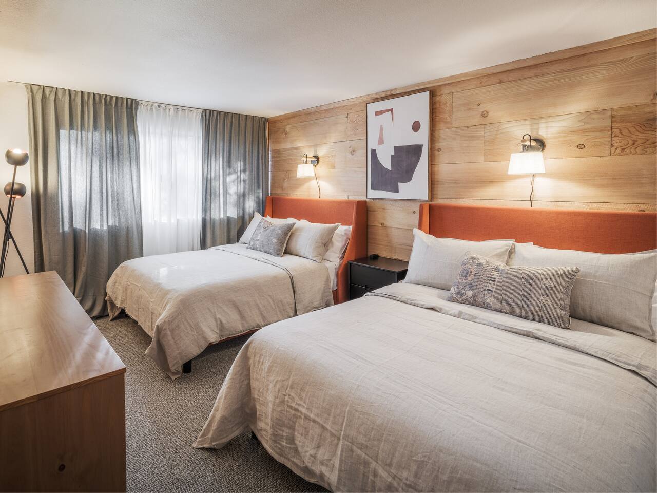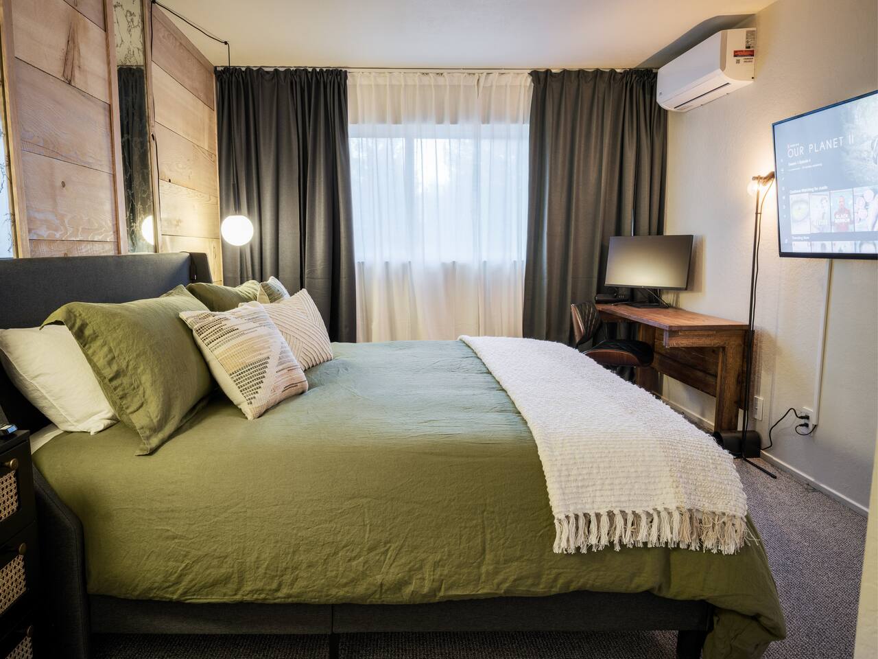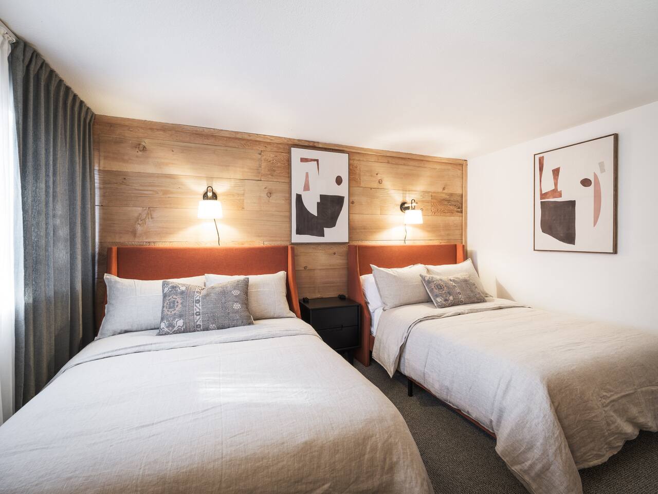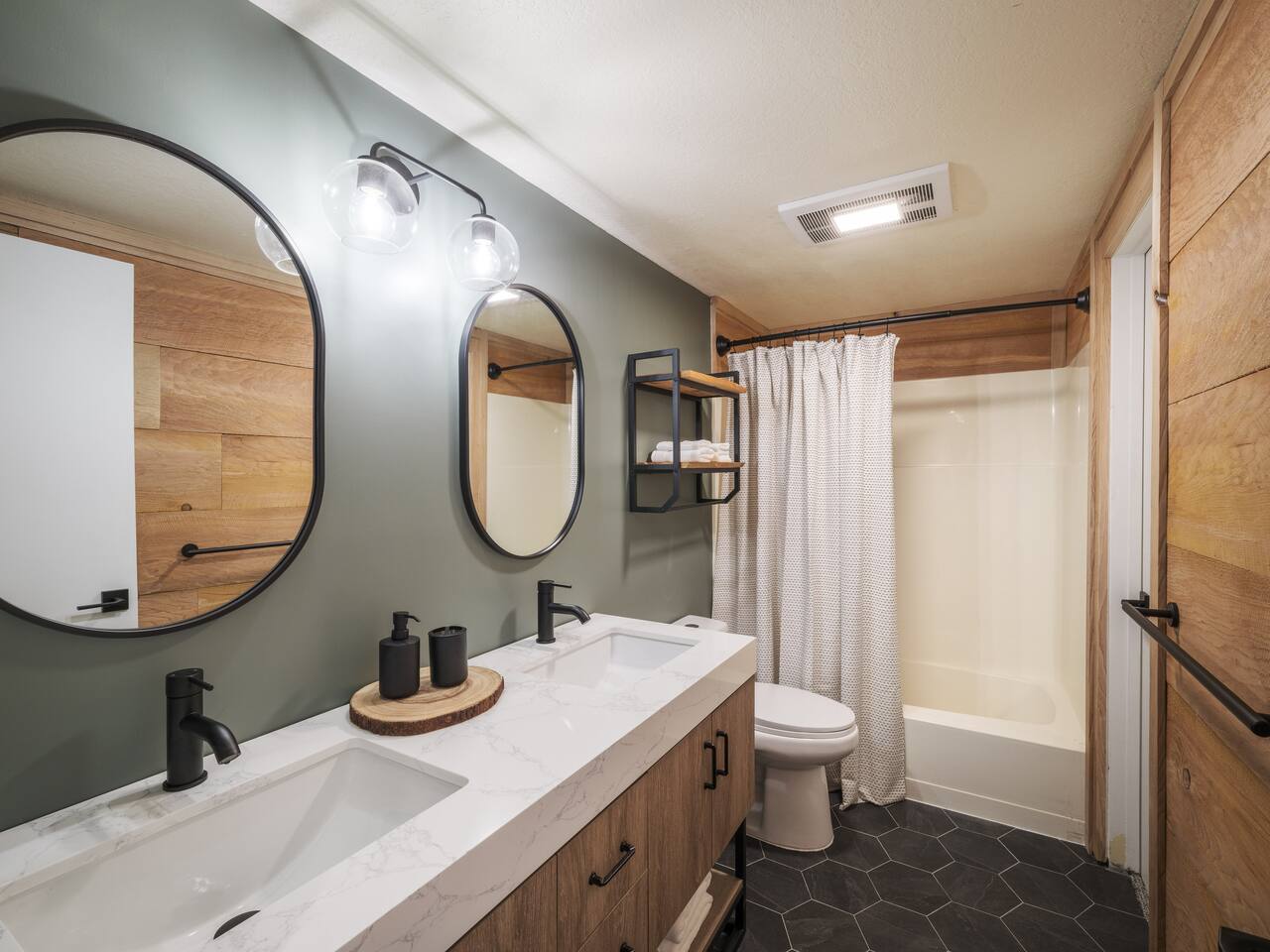 • ARTISAN DESIGN: Fall in love with the meticulous ceiling and wood details, handcrafted by a local artisan using sustainably sourced Fir. • PLUSH SLUMBER: Retreat to the master bedroom, outfitted with a king-sized bed draped in linen sheets atop an ultra-comfortable (and brand new) mattress. The loft boasts two full beds, also with linen sheets, ensuring restful nights for everyone. There's also a sleep sofa in the living room with queen mattress. • CHEF's PARADISE: The completely renovated designer kitchen awaits your culinary adventures. It's armed with an induction range, coffee maker, microwave, and spices. From whipping up quick breakfasts to crafting gourmet dinners, you have all the utensils at your fingertips. • UPDATED BATHS: Both our master bath and the upstairs bath come equipped with tubs and showers, with the master bath featuring a dual vanity. • LOFT-LIKE FEEL: The open floor plan and vaulted ceiling create a spacious and light-filled loft-like feel. Kick back in the living area, where the pull-out sofa and comfy chairs sit beneath a lofted ceiling. For entertainment, a 65” 4K TV with Apple TV ensures movie nights are always an option. • WORK AND PLAY: For those who mix business with leisure, a dedicated work area is set up with a monitor and desk. And when it's time to relax, let the Sonos sound system set the mood.
